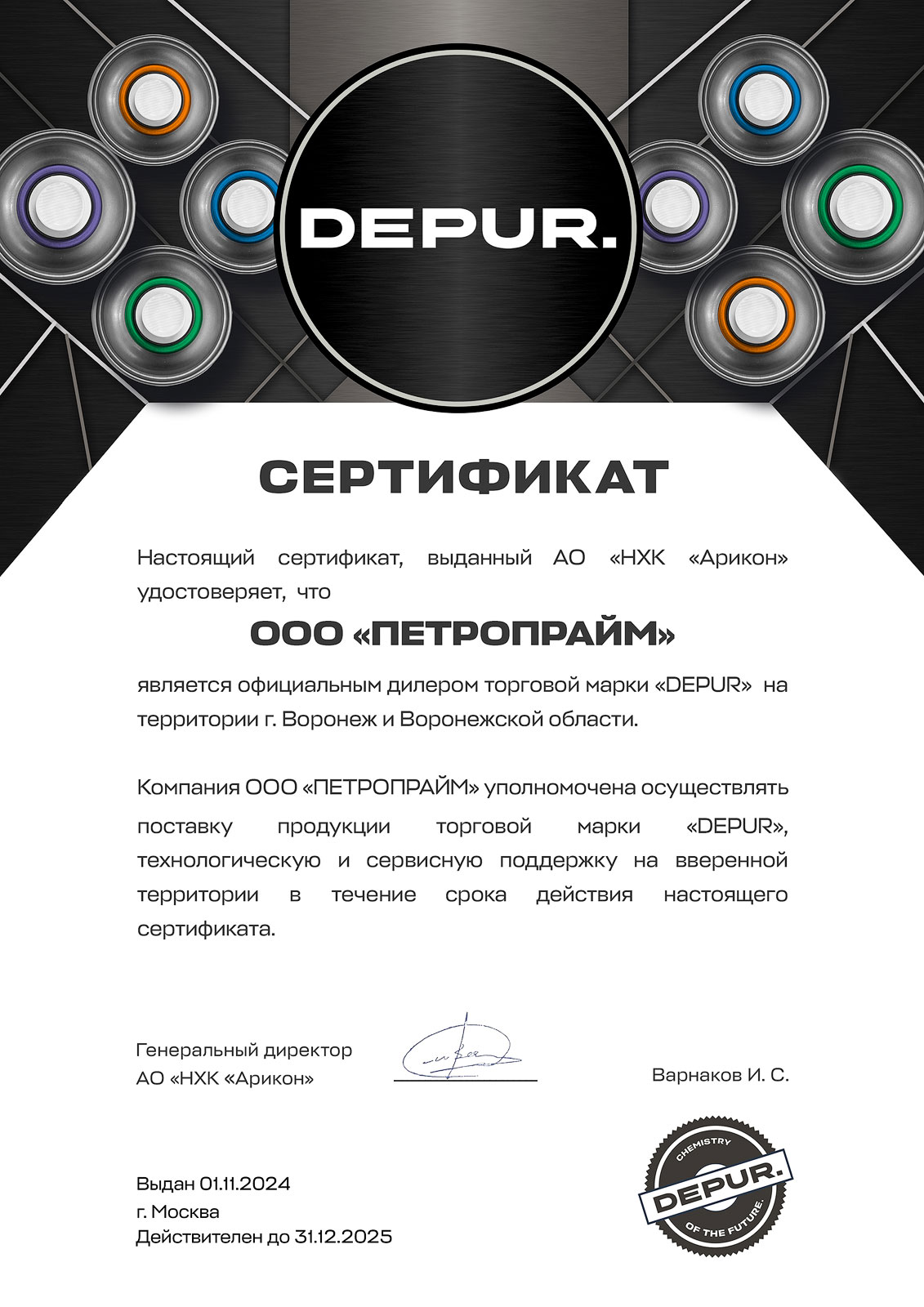 Сертификат дилера DEPUR.